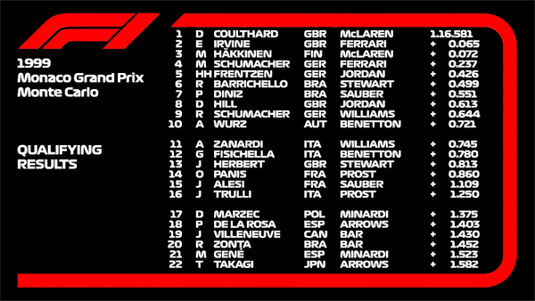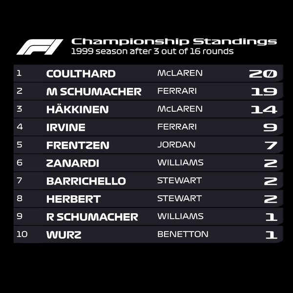 That means we'll go back to the start of the 1999 season. And that was quite an important season, because in that time Ferrari, McLaren and Williams were virtually tied in terms of constructor's world titles and race wins. Michael Schumacher is only a double world champion at this moment, while Mika Häkkinen is the defending world champion. Other former champions are Damon Hill (entering his final season) and Jacques Villeneuve, who was booted by Williams and decided to step into a brand new team called BAR or British American Racing.