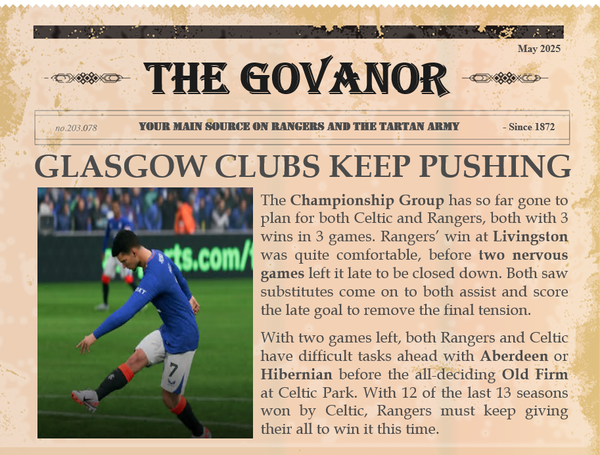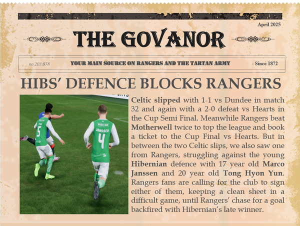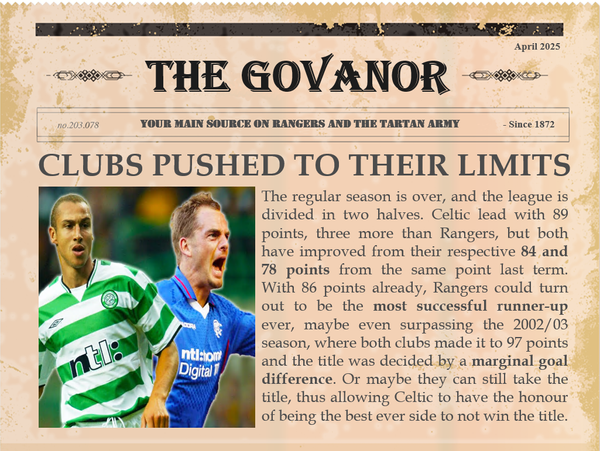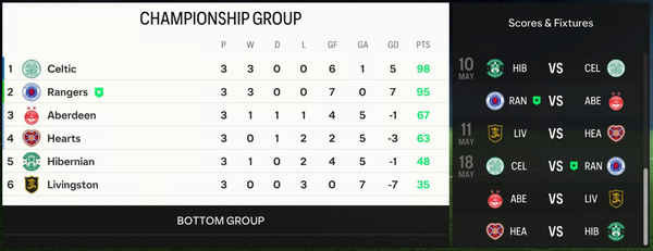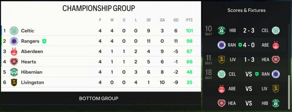 Bragging rights in Glasgow with another win against Celtic, but the loss to Hearts is costly. With the tough matches to come against Chelsea, this will be a test.Indeed. At one point I thought Celtic would win it, scoring so early, and that would have been game over, if they'd had an 8 points gap. Now the 2 points gap can be closed in the remaining derby in the Championship Round. So at least it's in my own hands again.