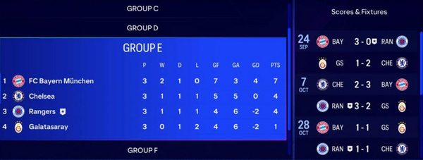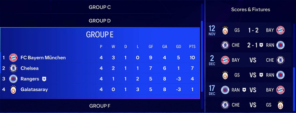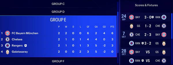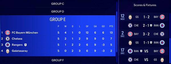 That 3-2 against Galatasaray is brilliant and opens up a road towards surviving European winter: I do not know about your playing style, but you might consider 'not losing' to Chelsea twice. That would get you to 5 points without Chelsea running away. Assuming Galatasaray gets a point against Bayern at best, you're nearly there in such scenario.