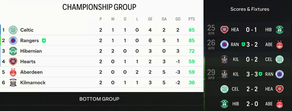Presumably, Celtic are top because they have more wins...?Glad you asked mate. St.Mirren was match 33, so the final game of the "regular season", before the league was divided in top and bottom groups. So you are on point assuming that the clubs in the top half only play their final five games against other clubs in the top.