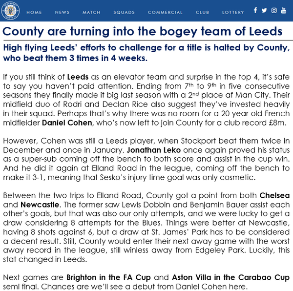 I think I jinxed you last time by predicting a good run of results and then you went 10 straight without a win. Fortunately things are turning around a bit and results are improving. Beating Leeds three times and then taking a player less than market value from them, Leeds fans must really be upset with you!