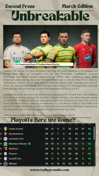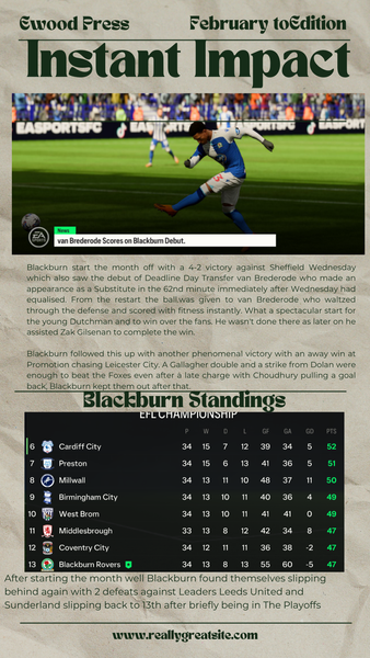 @Danimal5981 wrote:I do have a long term plan, I certainly don't see myself getting promoted this season definitely not top 2. I think with Blackburn losing a couple important players in the summer expectations were lower this year it's it's more about rebuilding/restructuring and forming a team. There are some players which in reality could still leave especially with another year in The Championship, but if can hold onto any of those and build around them to create a team that can grow in the Premier League over a few seasonsStill in striking distance for the play-offs, but one could also consider to take the route of reinforcing the team in order to dominate the Championship a second year running, so to make a good entry into the EPL.. In other words, have you thought long term about a plan, given the situation Blackburn are in? (consider it a media question 😉 )
