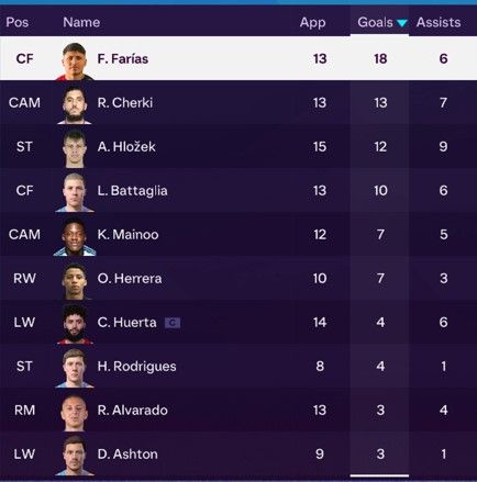 Farías continuing, and I'm sure he would lead that golden boot race, if only he played more games. Crazy goal per game rate there, especially with other players also having almost similar numbers. 13 in 13, 12 in 15, 10 in 13 etc. Your team doesn't lack goals / goal scorers.