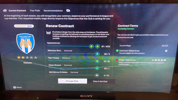 When you enter the Renew Contract screen, if you don't complete all the objectives, under Contract Terms, it mentions that you'll be continuing your contract as "The Club has decided to give you another chance and extend your contract by another year."