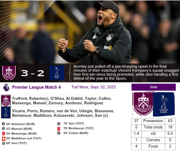 The home fans were singing loud from the start in a wet Turf Moor, not showing any fear facing the league leaders. Vincent Kompany's side followed suit going two goals up before Tottenham woke up. Tottenham took control of the match after the second goal but could not beat