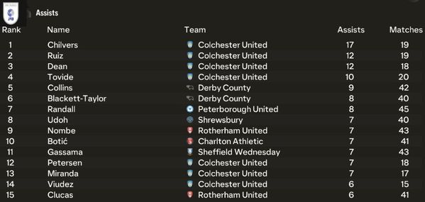 Colchester players dominate the assists chart, showing the creativity of the squad:
