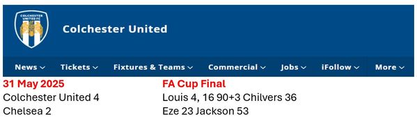 Firstly, they reached the final of the FA Cup for the first time in their history, with an end-to-end thriller at Wembley against Fulham. The scoreline of 4-2 disguised the fact that it was a close-run thing until Fabien Louis (who else?) made it safe in the 84th minute with the third of his hat-trick. Louis started the scoring early on, catching Fulham asleep in the 4th minute, and all the other Col U goals were breakaways.