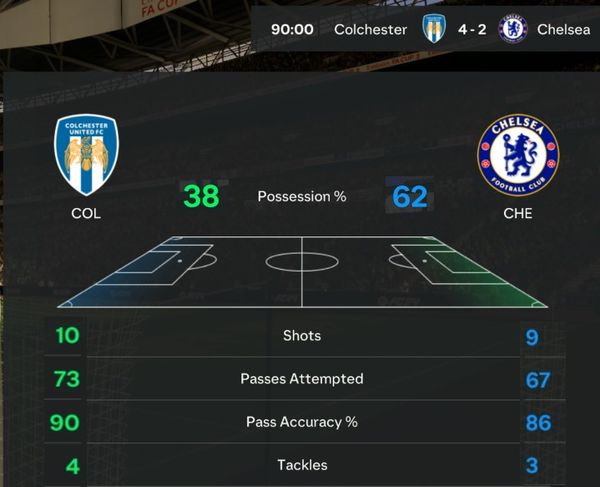 Ebereche Eze pulled one back for Chelsea, who had camped in the Colchester half, and we thought that would lead to an avalanche from the Premier League champions, but it was Noah Chilvers who scored next, latching on to a loose ball in the penalty area during a rare Colchester attack, to send the minnows in to the half-time break 3-1 up.