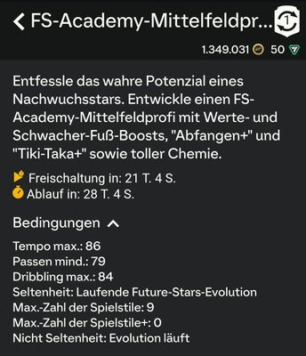 Du hast die Evolution "FS-Academy-Mittelfeldspieler" noch 21 Tage, 4h Zeit, diese Evolution mit einem Spieler freizuschalten (zu aktivieren) und 28 Tage, 4h um den Spieler fertig zu entwickeln.