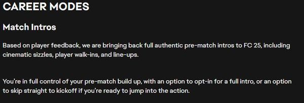 As you are aware, there have been some changes in the presentation of team lineups and formations in Manager and Player Career Mode.In previous titles, we noticed that many players tended to skip the extended intros, and in the process sometime miss important information and context. In FC 24, we shortened the intro scenes and presented that important information and context upfront.