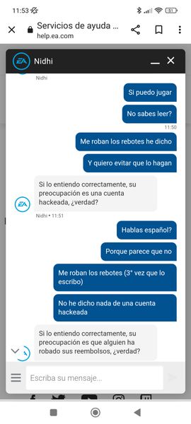 Hola estamos a eafc26 y sigue pasando lo mismo, intentamos adjuntar las pruebas pero no nos interesa perder nuestro tiempo en grabar vídeos para que vosotros veáis que el juego está mal, si desde que abrí este tema sigue existiendo el mismo problema a día de hoy es que no se ha hecho nada en todos estos años y estoy jugando ya en una consola totalmente distinta también, y el problema es que al reportar al rival no conseguimos nada no se nos devuelve lo robado y ni siquiera sancionan al jugador provocador del "robo" nos mandan mensajes al correo los de EA Sports diciendo que "han revisado nuestro caso pero no van a tomar medidas esta vez" y por lo tanto no conseguimos nada a cambio, de verdad pensáis que vamos a perder nuestro tiempo en seguir insistiendo en solucionarlo y grabar vídeos o capturas de pantalla para demostrar estos robos cuando vemos que en todos estos años no ha habido nadie de EA Sport que haya solucionado este problema?? Yo creo que ya no hace falta perder más tiempo si no lo vais a arreglar habrá directamente que denunciarlo porque nos estáis tomando el pelo como dije en el primer mensaje cuando abrí este tema, vuestra palabrería de "entiendo esto" "entiendo lo otro", no sirve de nada yo no llamo para o contacto para hablar contigo llamo para que me soluciones el problema que encima ya tampoco se puede llamar porque al menos en España habéis borrado el teléfono como medio de comunicación y por lo tanto tenemos que rezar porque el asistente que nos toque en el chat hable español y entienda nuestros mensajes porque sino es un suplicio como se ve en la captura hablo de rebote y el asesor entiende reembolso, dos cosas totalmente distintas, por favor podemos en serio porque a este paso la única solución que nos queda si no nos solucionáis vosotros vuestro problema es denunciaros a vosotros el departamento de asistencia al cliente ya que reclamando y reportando a EA Sport no se consigue nada porque en caso de que se le pongan multas o cosas de por el estilo tienen dinero suficiente para pagar en cambio si os reportamos a vosotros por no hacer vuestro trabajo evidentemente a EA sportle queda otra que echaros a la calle y de esta manera por lo menos vosotros deberíais de pensar si no quiero perder mi trabajo tengo que ayudar al cliente porque de eso se trata el contacto con vosotros para que nos ayudéis no para que os disculpéis espero que este mensaje os haya llegado y os haga pensar porque a este paso os vais a quedar solos si es verdad que FIFA ha encontrado otra empresa para sacar su juego tenéis la ventaja de que no hay competencia y por eso todo el mundo está con vosotros pero a la hora de la verdad cuando FIFA saque la competencia si estos errores ellos no los cometen se acabará vuestro tiempo de reinado y no os comeréis una m***** y si eso llega a pasar ya que vosotros no hacéis por ayudar me alegraré porque la gran mayoría de vosotros que no hacéis por ayudar vais a perder vuestro trabajo, que yo no me alegro de las desgracias ajenas pero sí creo que no merecéis vuestro sueldo por lo menos conmigo no habéis hecho vuestro trabajo nunca, en ninguna de las veces que he contactado con vosotros