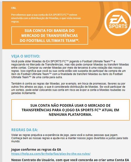 olá fui banido no mercado de transfrencia no ea fc 25, por conta que a ea me falo que comprei coins ou algo relacionado a trade, nunca efetuei compra de coins, e eles me baniu do mercado de transfren...