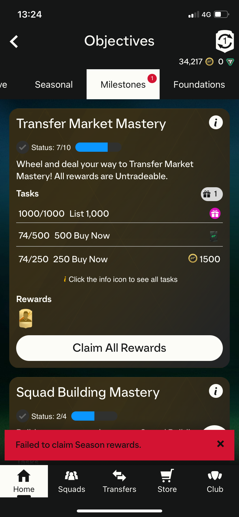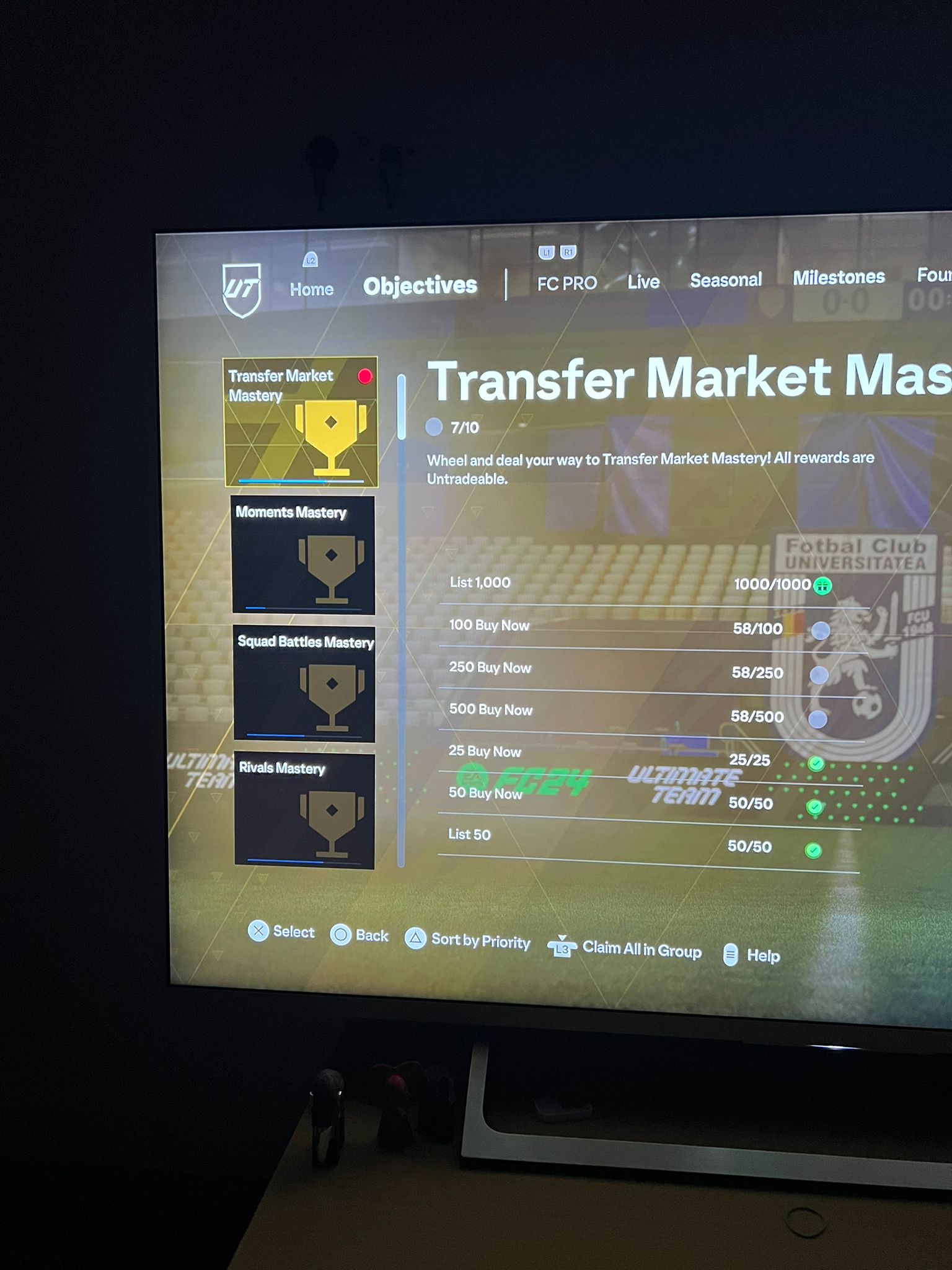 Steps: How can we find the bug ourselves? Go into Objectives, then select Milestones, and then try to claim the completed objective named “List 1,000” in the Transfer Market Mastery tab.