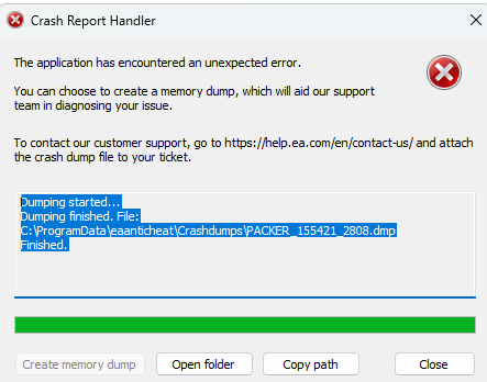 BhishmaOG2 years agoDumping started... Dumping finished. Dumping started... Dumping finished. File: C:\ProgramData\eaanticheat\Crashdumps\PACKER_155421_2808.dmp Finished. Screenshot 2024-02-18 160328.png18 KB