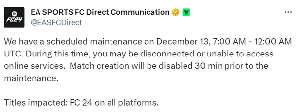 There is scheduled maintenance taking place right now. you might not be able to access online services while this is happening and they hope to have it wrapped up by noon today. Here is the Tweet/X post on it: EA SPORTS FC Direct Communication