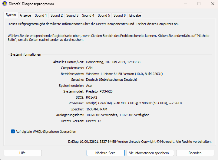 Bitte versuche auch einmal deinen Grafiktreiber neu zu installieren - ich bin mir nicht sicher, ob es wegen des inkompletten DxDiag ist, aber es fehlen sehr viele Informationen in der Anzeige.