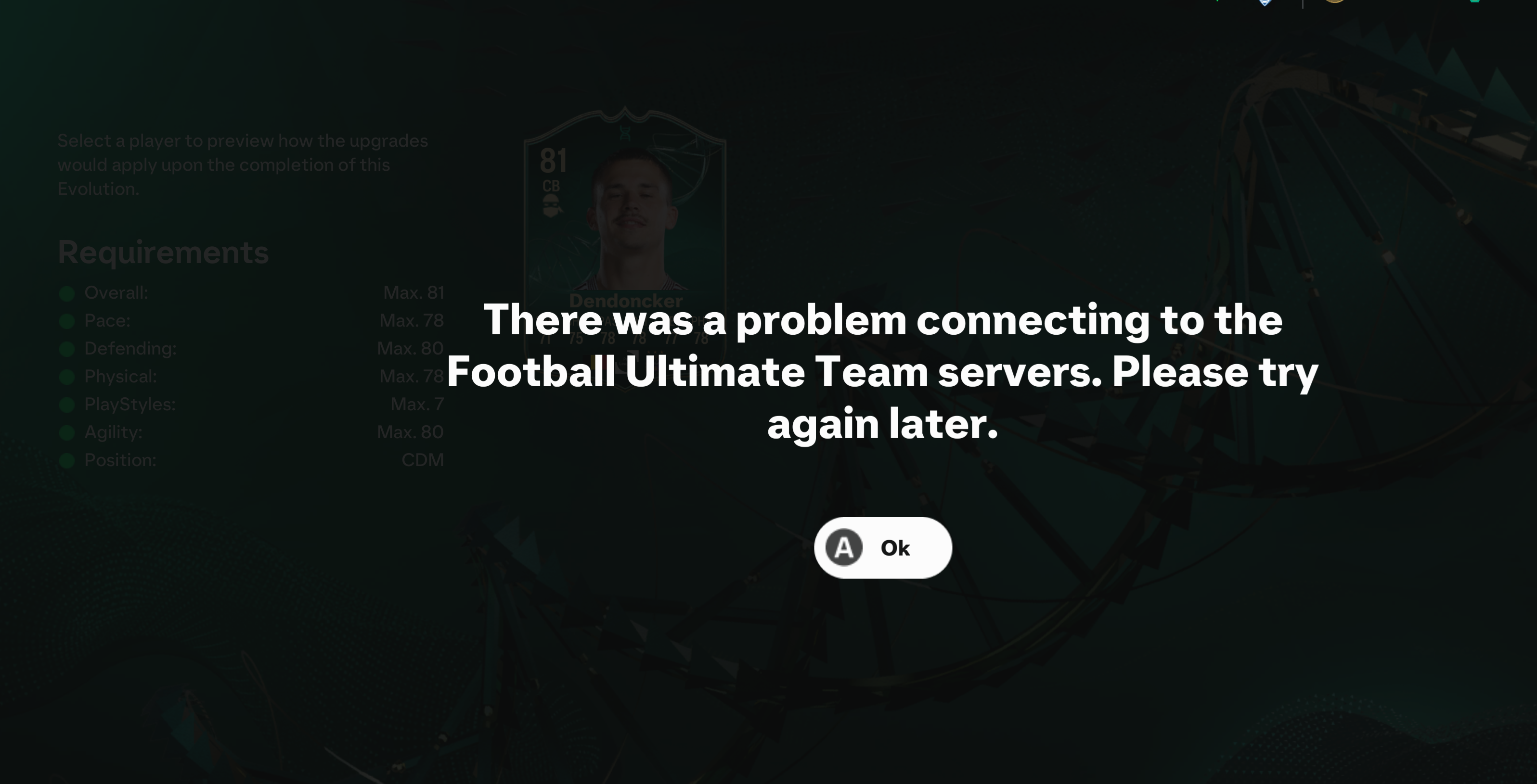I'm trying to evolve a player that fits in an evolution but when I try to do it I get 'There was a problem connecting to the football ultimate team servers. Please try again later."