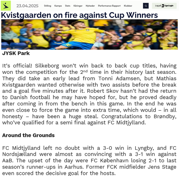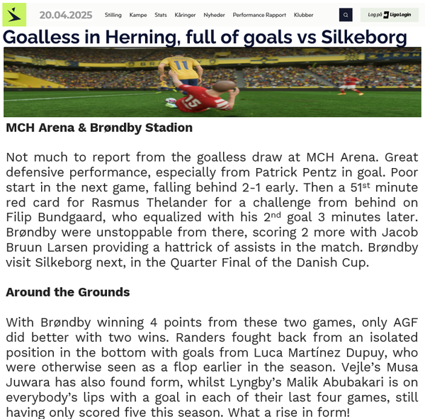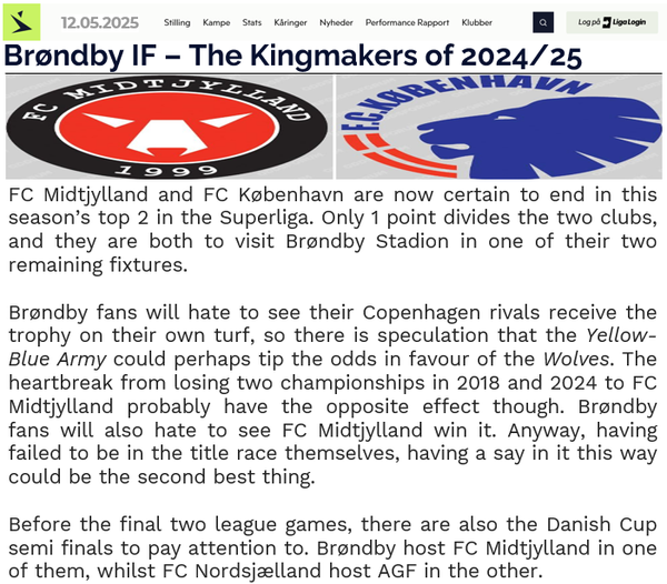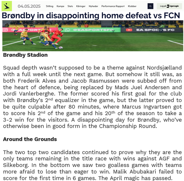 Shame the form couldn't continue against Købehavn, never a good day to lose to your rivals. Whilst the points are still there to play for 10 points gap may be considered steep at this stage, but also leaves something to build on