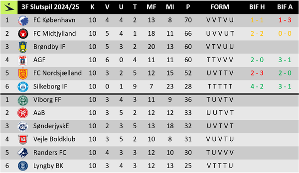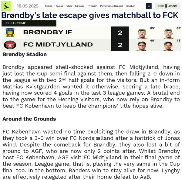 Shame the form couldn't continue against Købehavn, never a good day to lose to your rivals. Whilst the points are still there to play for 10 points gap may be considered steep at this stage, but also leaves something to build on