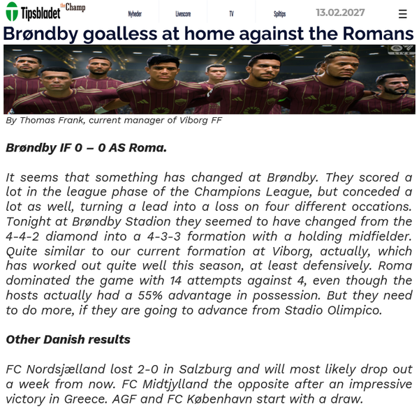 Yeah I can't believe it. Especially since I'm also playing Champions League games with Brøndby in the parallel save. As well as international games with Denmark. And goals are flying in, both in the Champions League and in the international games. But with Viborg, somehow it often ends goalless or with just one goal scored in the match.