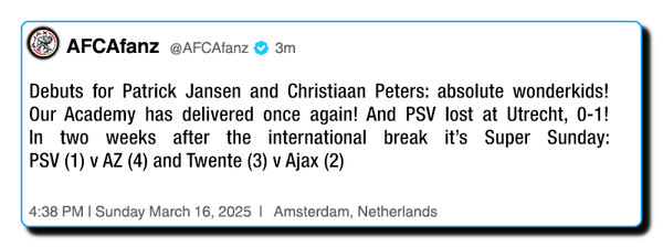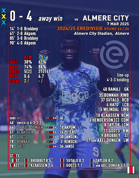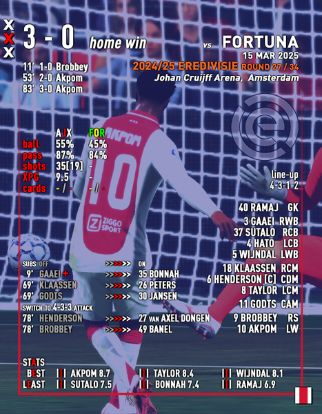 @JustinCase0110 wrote:You're in good form. The 3-0 and 4-0 wins are classic Ajax, and beating PSV 2-0 can be seen as a milestone win for your current season.