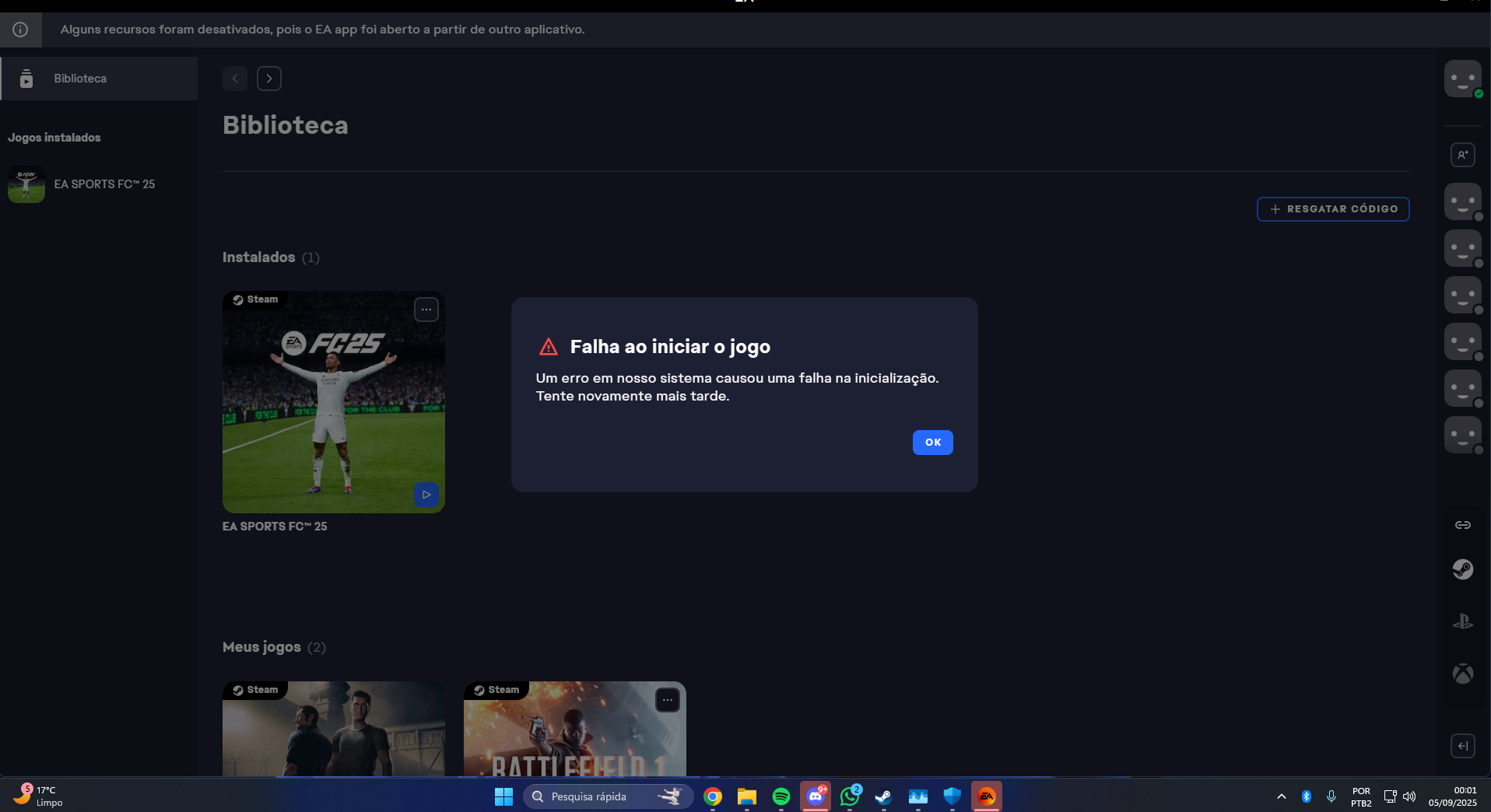 finalizei o fifa normal quando fui jogar no outro dia começou a dar erro na inicialização no aplicativo da ea e ja faz 2 dias que não consigo jogar pois esta dando esse erro que vou deixar anexado abaixo