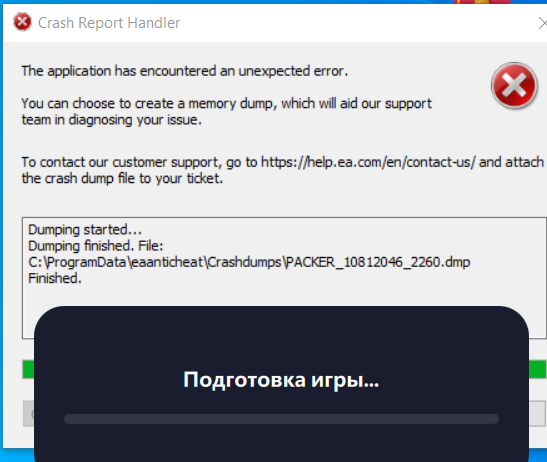 Через некоторое время появляется вторая аналогичная ошибка, и пропадает окошко "Подготовка игры...".