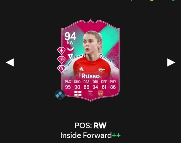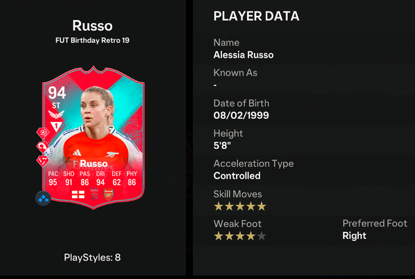 I previously put this Russo Card into one of the FUT Birthday Evos that granted her Quick Step+. As Arsenal Womens have reached the WCL Final she has received +1 Playstyle. Rather than adding it on top of the already given Playstyles (like the FUT Fantasy Fermin cards) it has replaced Quick Step+ with Tiki Taka+.