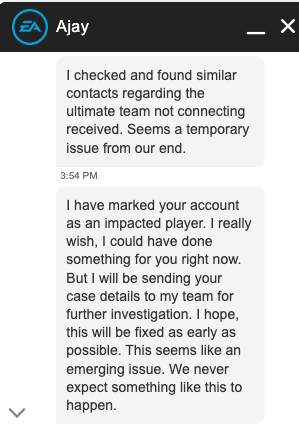 It’s been 2 hours of loading screens and 0 help from the live chat, I’ve been unable to get into ultimate team. I’m able to play clubs and any other game on my console, my internet is fine, ea page says connection to the servers is “great”, yet I still can’t log in. I’ve even tried the useless troubleshooting steps and nothing works. Am I the only one?