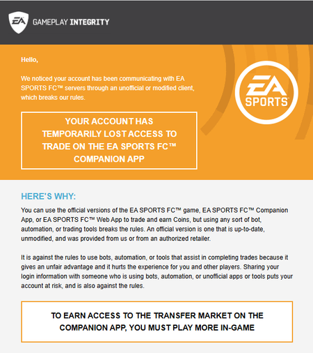 On December 24, 2025, i got an email saying, "We noticed your account has been communicating with EA SPORTS FCTM servers through an unofficial or modified client, which breaks our rules Your account...