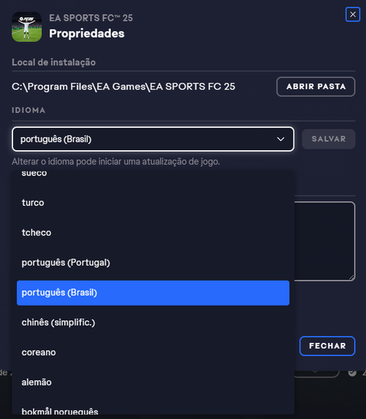 Não consegui localizar lá no EA APP configurações de jogo. Tentei mudar o idioma do EA APP e mudar o idioma de instalação do EA FC mas ambos não funcionaram