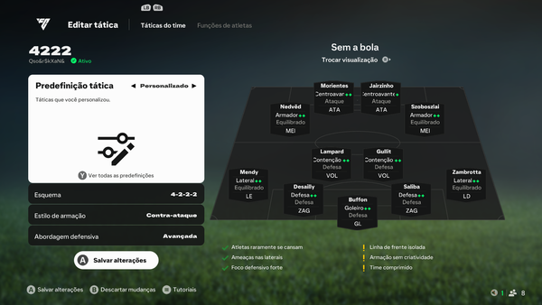 temporadas fc 25 não consigo salvar as alteraçoes que faço em minhas taticas personalisadas, um exemplo, estou tentando jogar esquema 4-5-1 em linha, armação padrão e estilo ofensivo 90, porem para ser salva tal tatica é impossivel, eu vou m onto o time coloco todos nas posiçoes e como eu quero levar o jogo, porem quando o jogo começa a formação e toralmente diferente, uma bagunça muitos fora das posiçoes, e sem dizer que o estilo ofencifo vota para 70, meu isso é realmente chato porque vc perde um tempão montando time e salva e os carambas, e no meio do jogo vc vai ver porque seu time não esta rendendo vc ve uma coisa destas assim fica realmente dificil para bater de frente com os adversarios que estão com o time montadinho pura covardia, não sou pro player mais jogo para o gasto derreopente tomar 11 a 0 ai ago esta muito errado, não posso jogar meu jogo fora paguei um a bala ( uma grana) nele, vcs da EA que tanto respeito e tenho admiração tem que resolver isso pelo amor de Deus, cara não da para ficar tomando vareio de uns caras que monta o time com 05 atacantes e só sabem correr etc, precisamos que alguem resolva este bug dos infernos ...