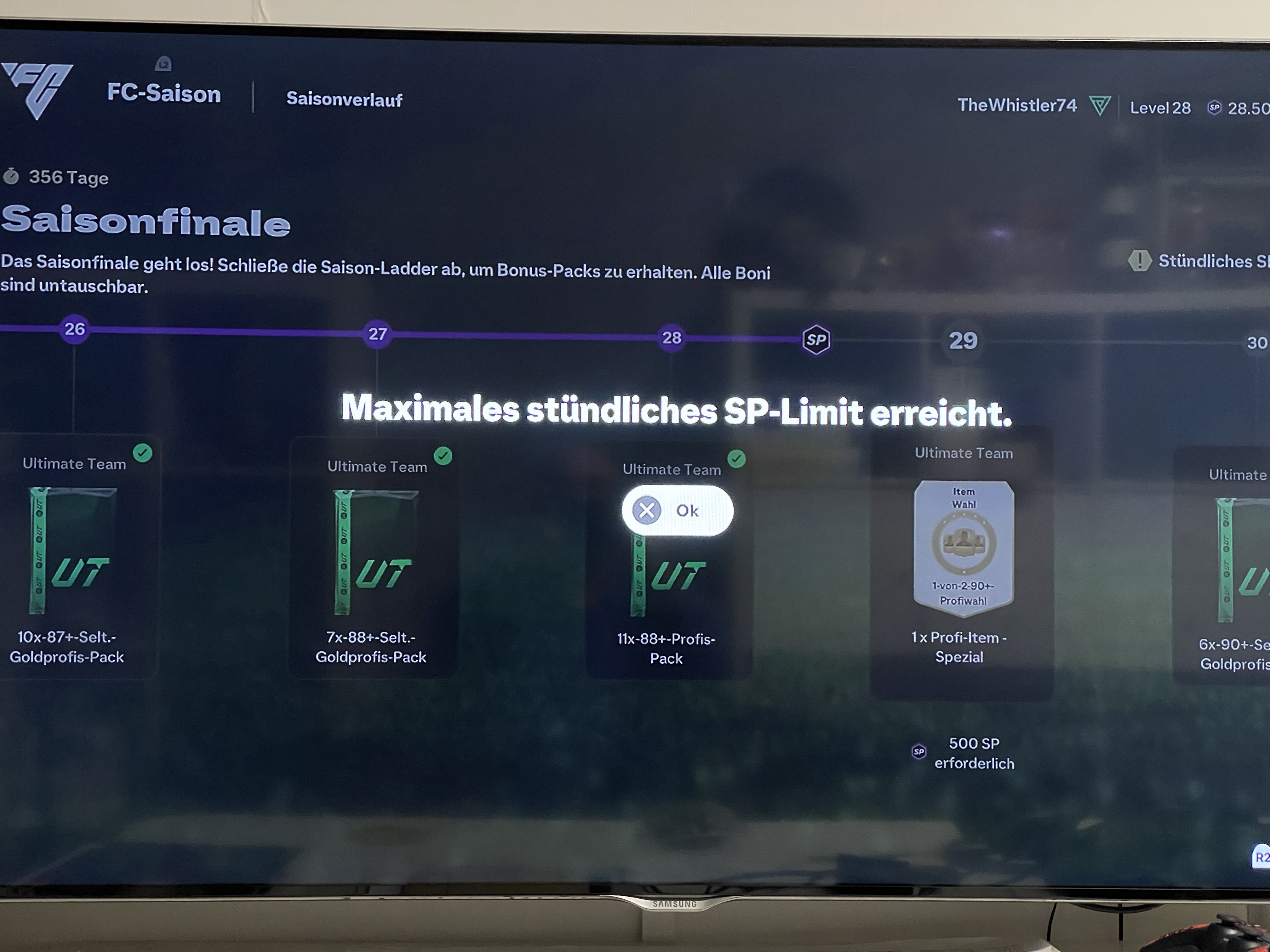 Ich spiele auf der PS5 ich habe heute morgen nach dem ich ein paar Aufgaben gelöst haben mit den erzielten Toren die Meldung bekommen das ich das stündliches SP Limit erreicht habe. Die Punkte sind weg die Aufgaben geschlossen und nun fehlen mir diese besagten fehlenden Punkte um den Season Pass abzuschließen. Da für 25 ja auch keine neuen Aufgaben kommen, kann ich den Pass auch nicht an anderen Tagen abschließen und die Belohnungen erhalten.