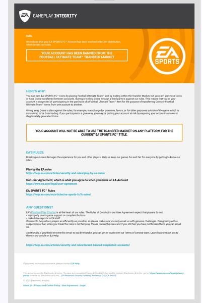 This morning I suddenly got an email from EA saying that my account has been banned from the football ultimate team transfer market because I was involved in coin distribution.