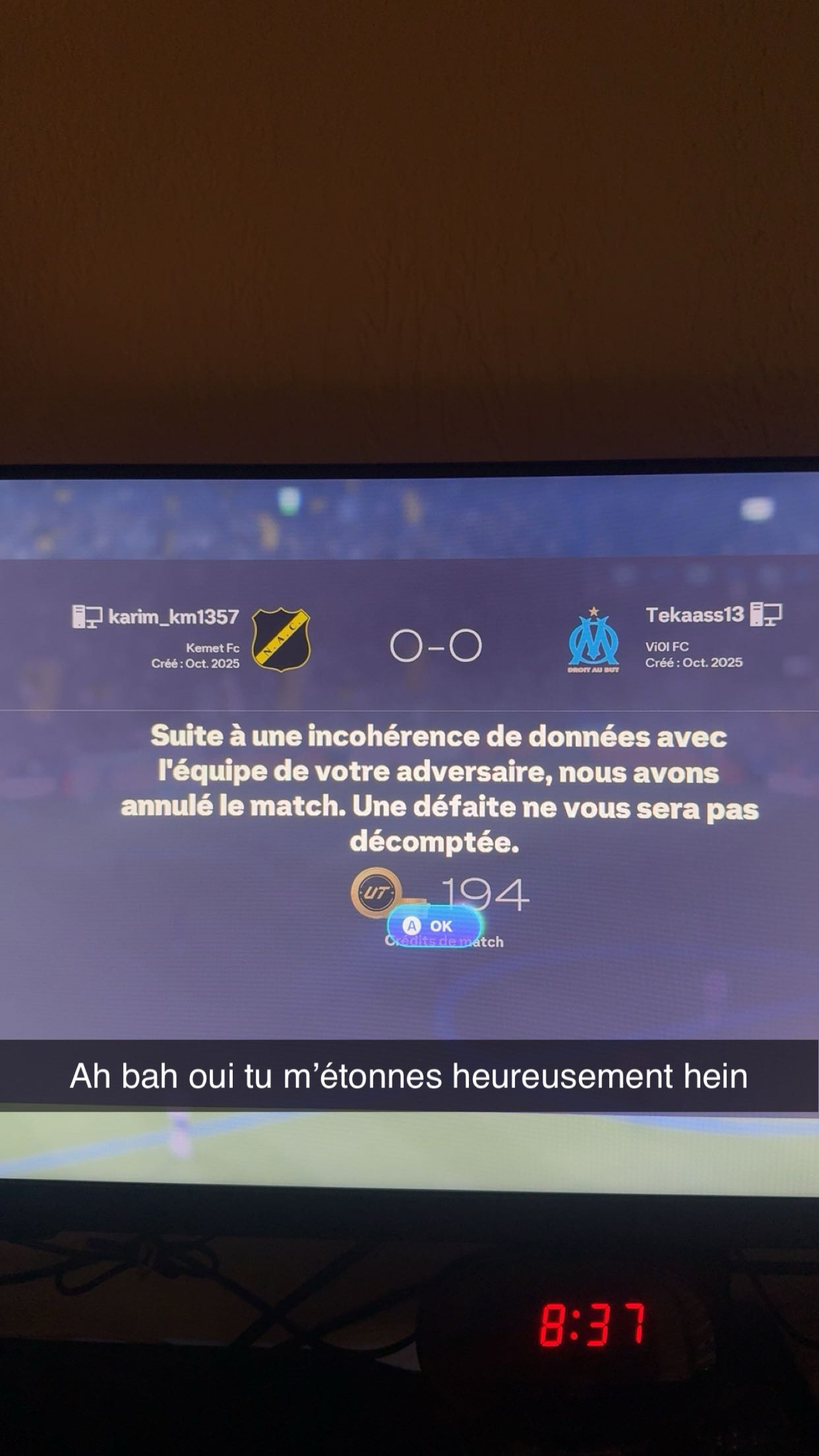 Suite à une incohérence de données avec l'équipe de votre adversaire, nous avons annulé le match. Une défaite ne vous sera pas décomptée.