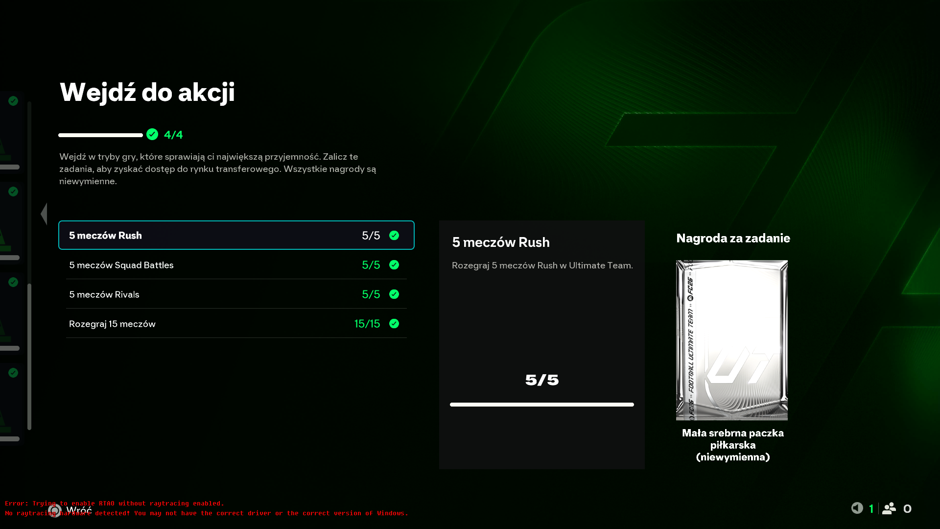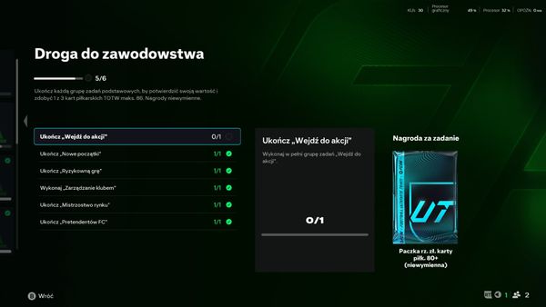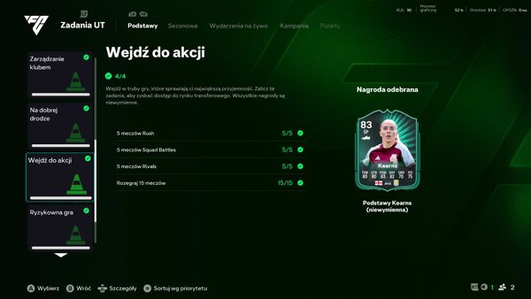 Wykonałem wszystkie zadania, aby odebrać  1 z 3 kart team of the week w zadaniach "Droga do zawodowstwa", ale nie chce mi zaliczyć wyzwania "wejdź do akcji" mimo że jak widać na screenach wykonałem wszystkie zadania. Za chwilę nowa drużyna tygodnia, a ja chcę spróbować szczęścia z trafieniem Marcosa Liorente...