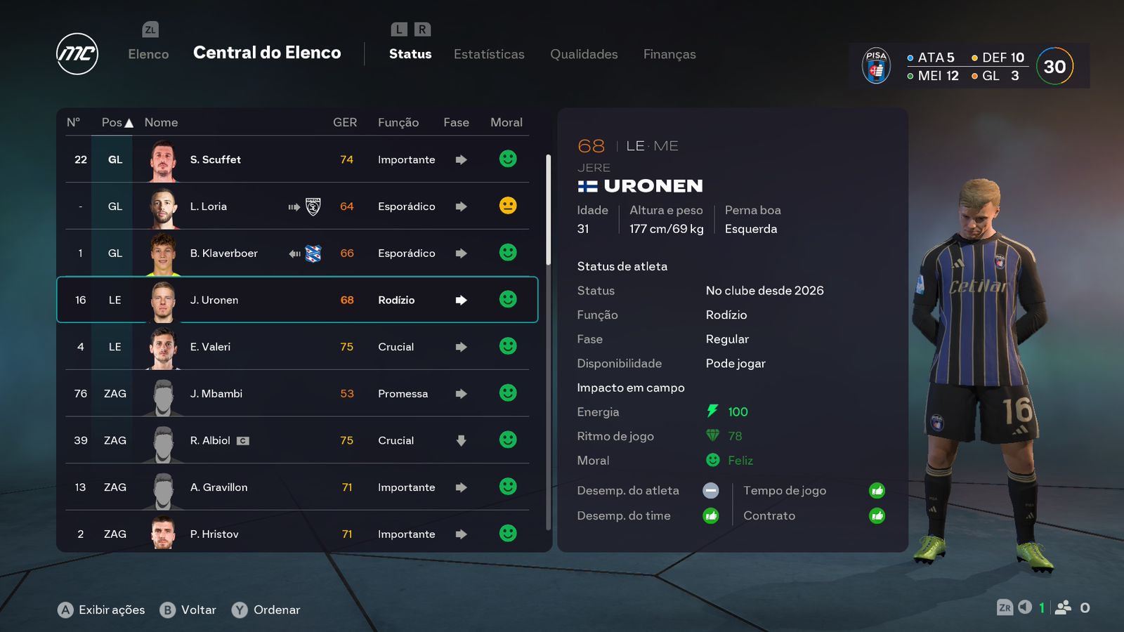 Em anexo, envio fotos do status de ambos os jogadores e do histórico de transferências do clube, para auxiliar na análise. Infelizmente, não consegui capturar imagens do bug dos objetos e jogadores estáticos em campo.