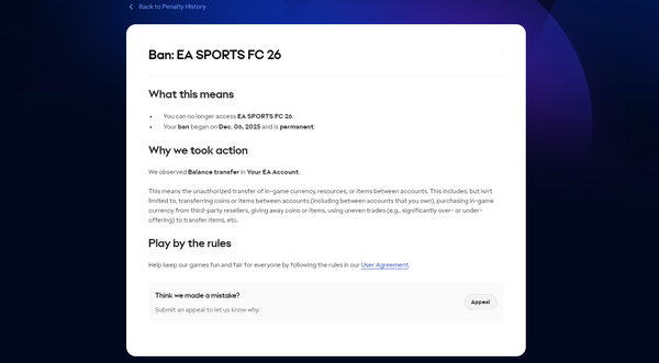 Yesterday my EA account was hit with a 14-day suspension for the reason: “We observed Balance transfer in Your EA Account.”
