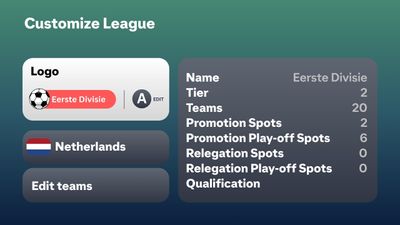 Country selection concept on the right it says how many leagues are currently created/standardly in the game you can make a league in every country/region in the worldLeague editor concept, for this would be an example "Screenshot" for when you are recreating the Eerste Divisie, the second tier of Dutch football,Under here is an explanation of the features