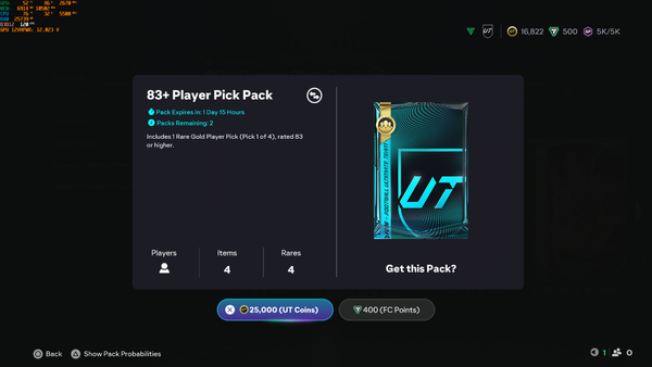 Includes 1 Rare Gold Player Pick (Pick 1 of 4), rated 83 or higher.