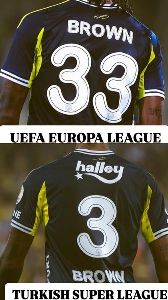 Fenerbahçe uses the Arial Rounded font for both Süper Lig and UEFA Europa League matches. Super Lig: Numbers on top, player names below. UEFA Europa League: Player names on top, numbers below (as per UEFA regulations).
