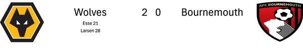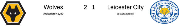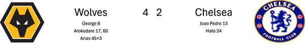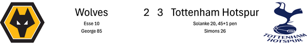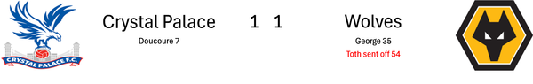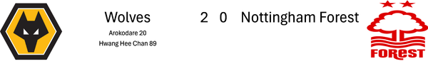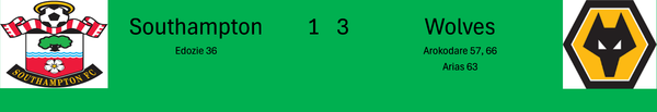 Wolves (4-3-3): Agirrezabala, Garcia, Goes, Krejci, Wolfe, Florentino, Ward-Prowse, Gomes, Esse, Arokodare, George