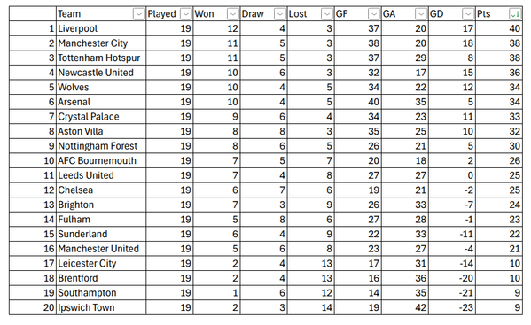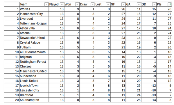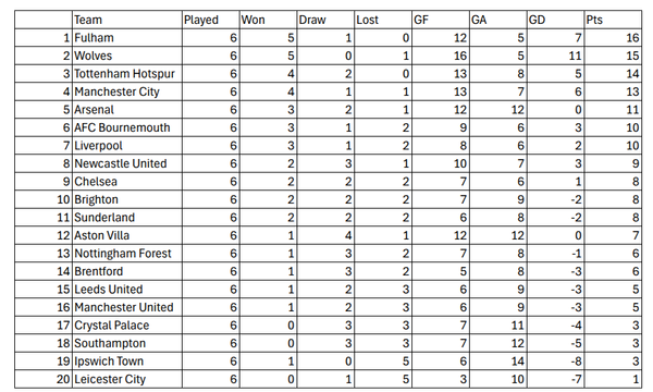 Great form continues. Best attack in the league and the best defence as well. Wow, that 6-2 against Arsenal really was something. If only you'd scored two more, it would have reminded me of something 😄