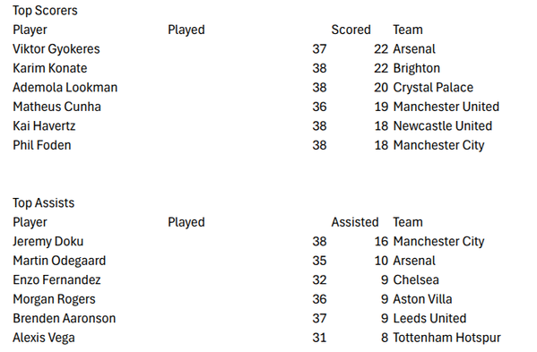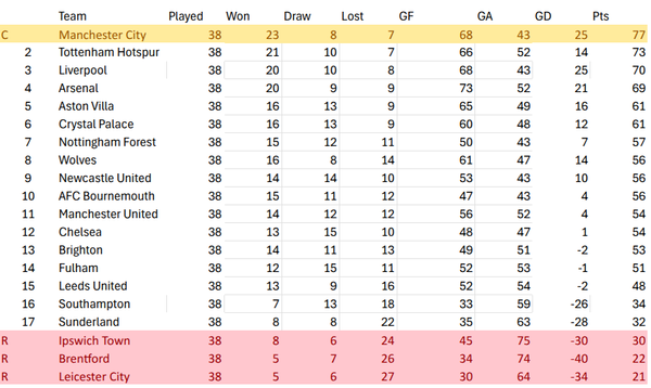 Not the most competitive season in Premier League history. Winning the league with 77 points, that hasn't been possible since the 96/97-season, where Man United won it with 75 points. Only 5 points from the last 4 games must be a disappointment, but you could see Man City running away, and with the 5th place at a distance, perhaps there was a lack of motivation to end the season on a high. Having the league top scorer and the EPL Player of the Season must be something you can build on towards the upcoming season. Good luck with the summer business. It will be interesting to see how you approach this...