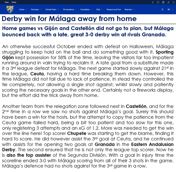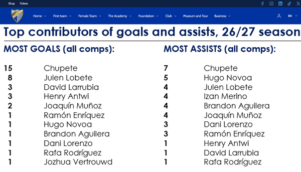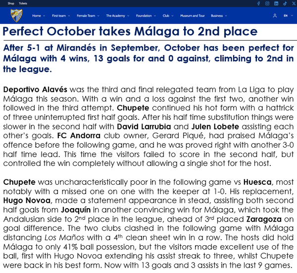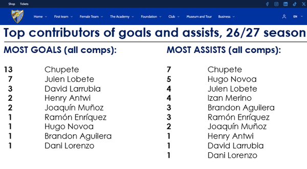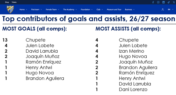 Yes, that is true. 12 goals so far with 10 of them either scored or assisted by this Chupete fellow. At 21 he could very well be targeted by bigger clubs and perhaps be a future prospect for a Spanish national team, who traditionally has a hard time finding a great number 9 to spearhead an otherwise very talented side. I suppose we'll have to wait and see how long I can keep him and how he develops. But yeah, he does need continuous help from his teammates.