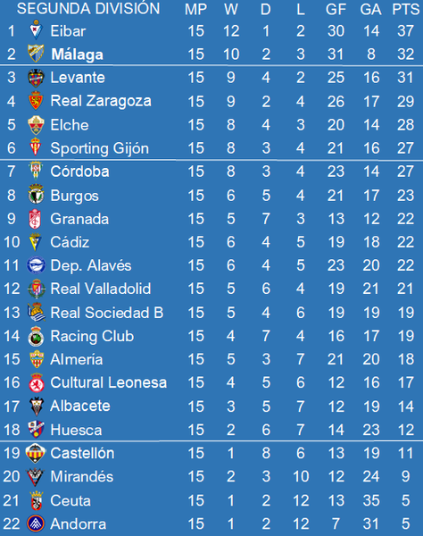 Indeed. At this point only the two recent home games (5 points lost) mark the difference to the top, so it's certainly not crazy to think that a bit more consistency could soon throw Eibar off the top spot. On the other hand, Levante do push hard from the rear, so another slip could see them relegate Málaga to the playoff positions. Consistency really is key.