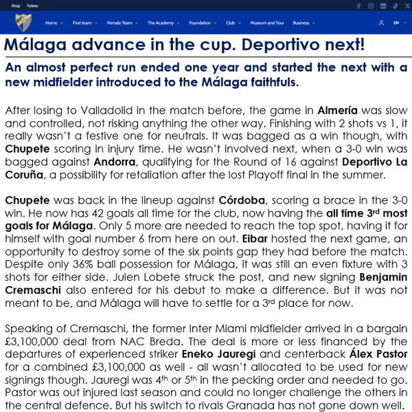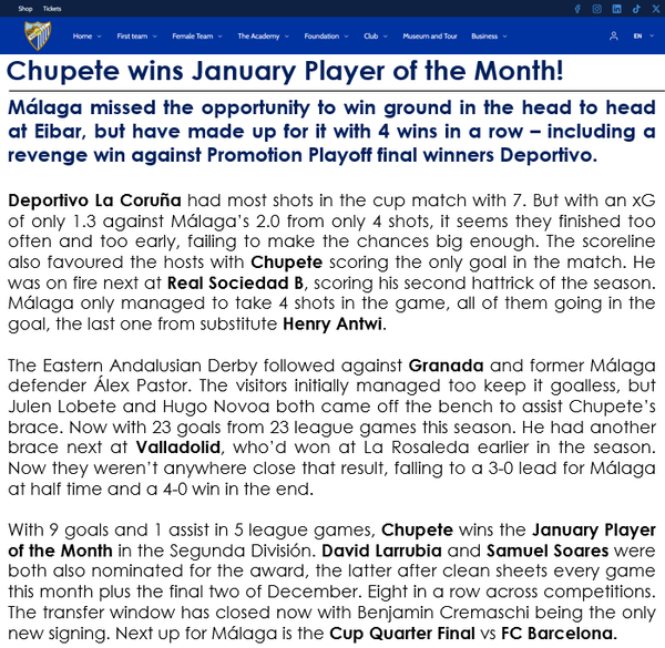 Hopefully Cremashchi can add some real quality to the midfield and help the team in the second half of the season. The first half hasn't been awful the team are in the race for the title but third place creates a lottery of play offs if the team find some form they could overthrow both Levante and Eibar.