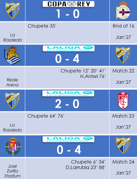 Top scorers least goals conceded and Chupete scoring for fun the team have really settled now and with the gap being just one point and still to play Eibar at home the team really look like favourites for the title now they appear really efficient in front of goal scoring form most shots they take whilst being really hard to create clear cut chances against. Tough tie coming up against Barcelona hopefully the team can cause a shock but the main focus is the league and trying to win it now!