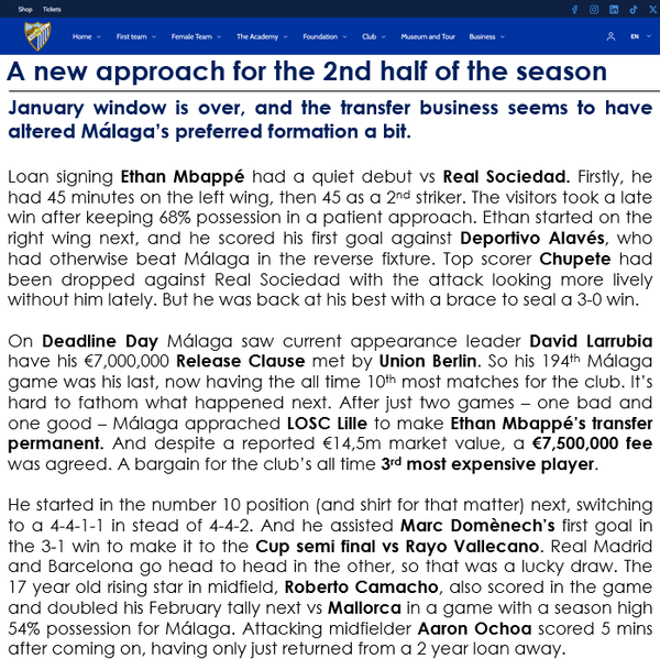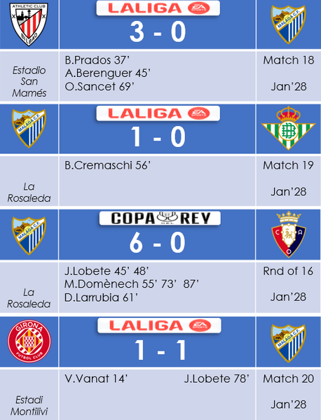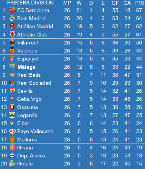 Some disappointing results going 2-0 up and drawing with Leganes and then losing 3-0 vs Villarreal but the team are so close to the final I believe the final is one leg so that is your chance to secure history and a european place next season which would be amazing in your first season in La Liga and would hopefully see the team spend a bit more money in the summer. Chupete with 11 goals isn't bad for his first year with 12 games left why not aim for 20 and see where you go but it has been a strong season for Malaga and I'm sure the board are delighted. Hopefully Camacho can realise his strong potential a loan normally sees them progress faster but it will be interesting to see him go at the club