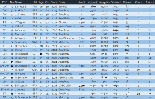 Yes, he really did, Chupete. More goals than the Player of the Season Kylian Mbappé. I hope I can keep him too, but I also have Marc Domènech standing by, both top scorer and top assister in the cup. He's mostly started on the bench or on the wing in league games and could benefit from more action in the number 9 spot. But with Europa League action ahead, he could also be the main man there, whilst Chupete continues to be trusted in La Liga. If they both stay...
